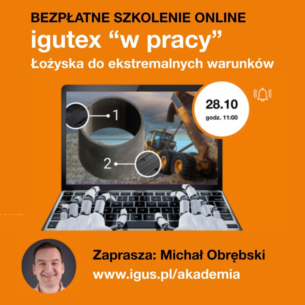 Dołącz do webinaru o bezobsługowych łożyskach ślizgowych igutex do heavy-duty. Włókno szklane + niskie tarcie powłoki = wytrzymałość bez smarowania. Idealne dla rolnictwa, budownictwa i górnictwa. Więcej opowie Michał Obrębski.