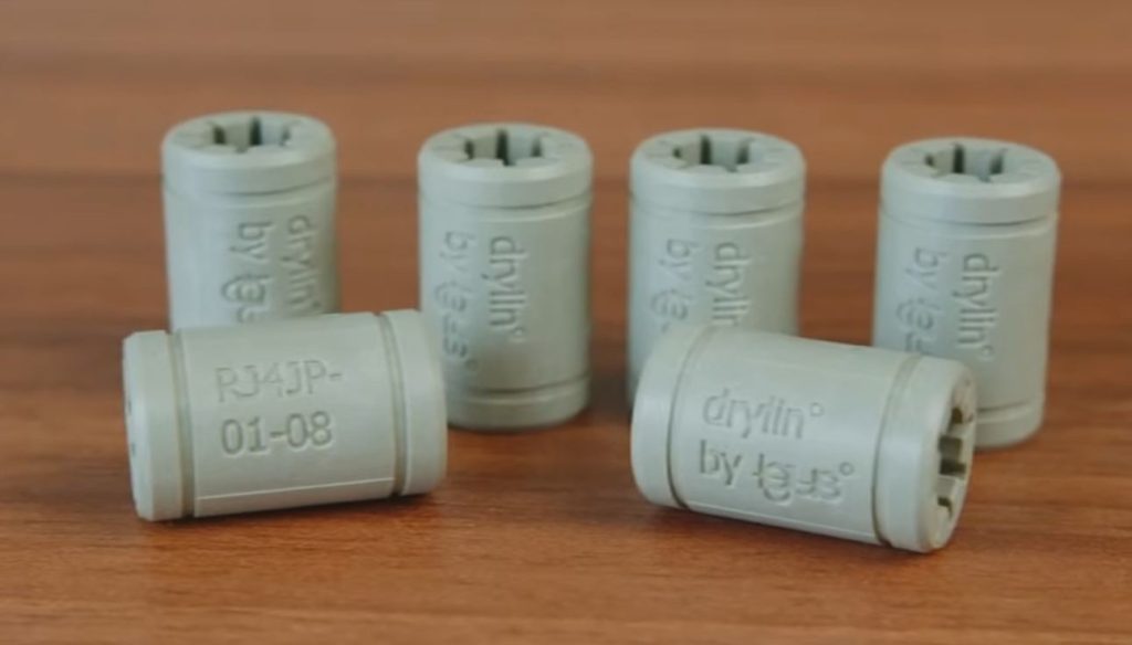 - Łożyska liniowe drylin® RJ4JP – pasujące na standardowe wałki 8 mm, ale działające zupełnie inaczej niż ich metalowe odpowiedniki kulkowe: bezsmarowo, bez hałasu, z odpornością na zużycie.